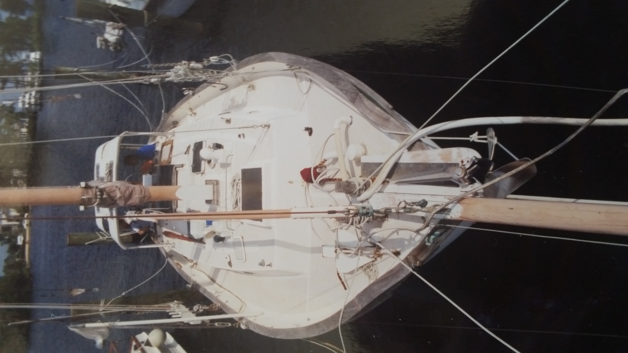 Here she is shown from the bowsprit end. Value would be greatly increased by cleaning, bleaching, and re-finishing the teak trim. We have instructions for that. |