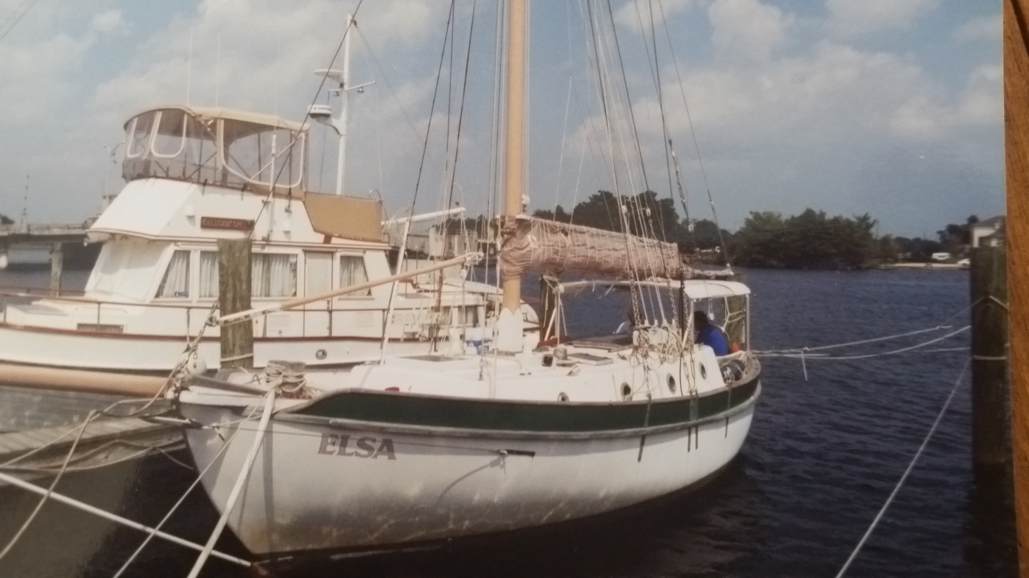 Looking at the vessel from the port side forward. Note the need for cleaning, bleaching, and refinishing the teak trim, which would increase value a lot. |
