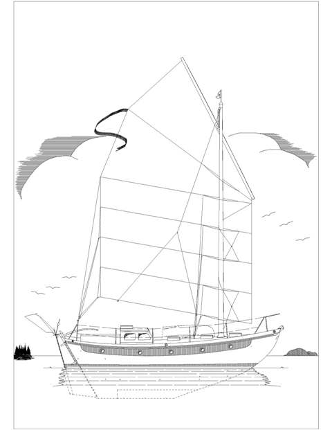 We ran out of British coin names when we got this far! This is about the upper limit of size for a practical single Chinese lug sail rig. Were we to go larger we would opt for a two sail rig with a small foresail and large main--a Chinese schooner. Crown Jewel is big enough to carry this rig, if desired, but she would be much more efficient with the rig shown. In this size, the Coin Collection concept leaves behind any need for extra freeboard to achieve the flush deck configuration, and the result is a rather sleek looking vessel. Interior space approaches that of many fifty-footers, and the deck space is equally impressive and useful. Crown Jewel can be built with either a wheel house or a control hatch.