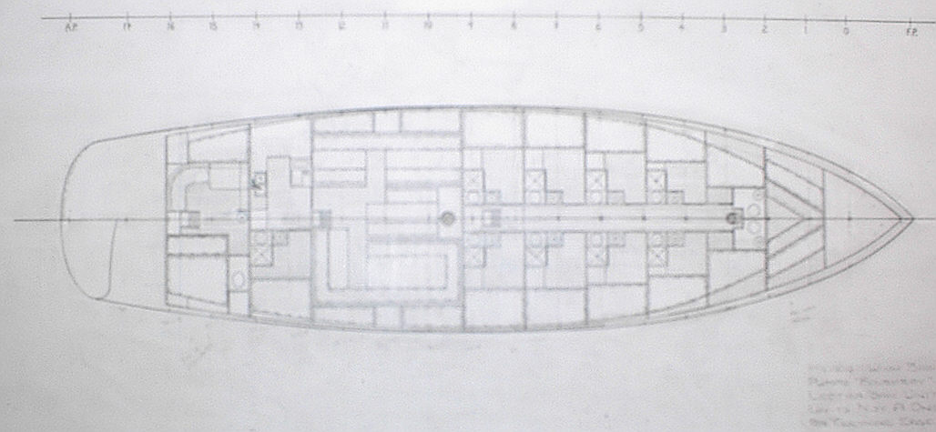 In this rough sketch of the interior you will see, from forward, double chain lockers right up in the eyes of the ship. There is a fully watertight bulkhead aft of this. Next aft there is a cabin used for crew's quarters. It is shown with over and under berths for four. However I personally would convert the lower berths to settees and put a small head between the berths at the forward end. A wash basin would be against the aft bulkhead to one side of the ladder. Again there is a fully watertight bulkhead at the end end of this compartment. From here aft to the main saloon there are 10 double staterooms, each of which has a head with shower and a wash basin. Pipe berths can be rigged above the double berths if accommodation for a young child is needed. There are also four alcove berths in the saloon, where older children or singles can be accommodated. At the aft end of the area containing the double staterooms there is another watertight bulkhead. The main saloon is devoted largely to a several tables and the accompanying settees, which allow the maximum number of people to sit down together at one time. The galley and the cook's quarters are just aft of the saloon The cook's quarters contains a double berth and its own head and shower. Should the captain and cook be a married couple this cabin would be available for another pair of passengers. Aft of the galley there is another full watertight bulkhead aft of which is the master's quarters with a large navigation area to port and lounging settee aft of it and a pilot berth outboard. To starboard is a double berth with a settee berth below it. Forward of the double there is a head. All in all this is a much more luxurious interior for both passengers and crew than is usually seen and we feel that Freedom's Song could command a premium fee from passengers.