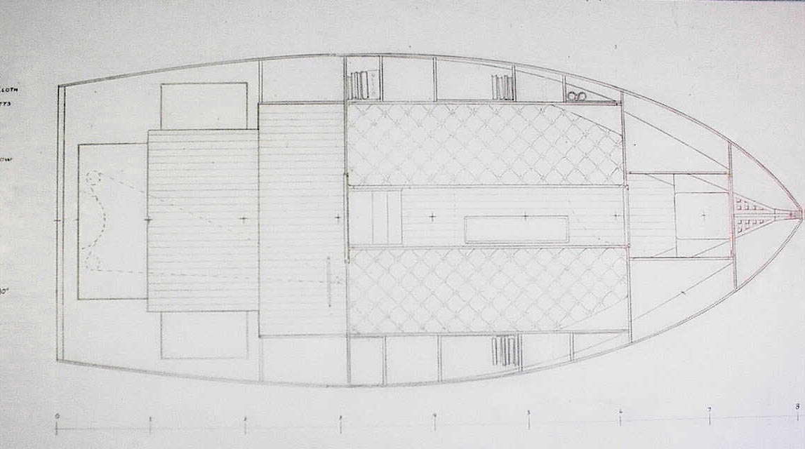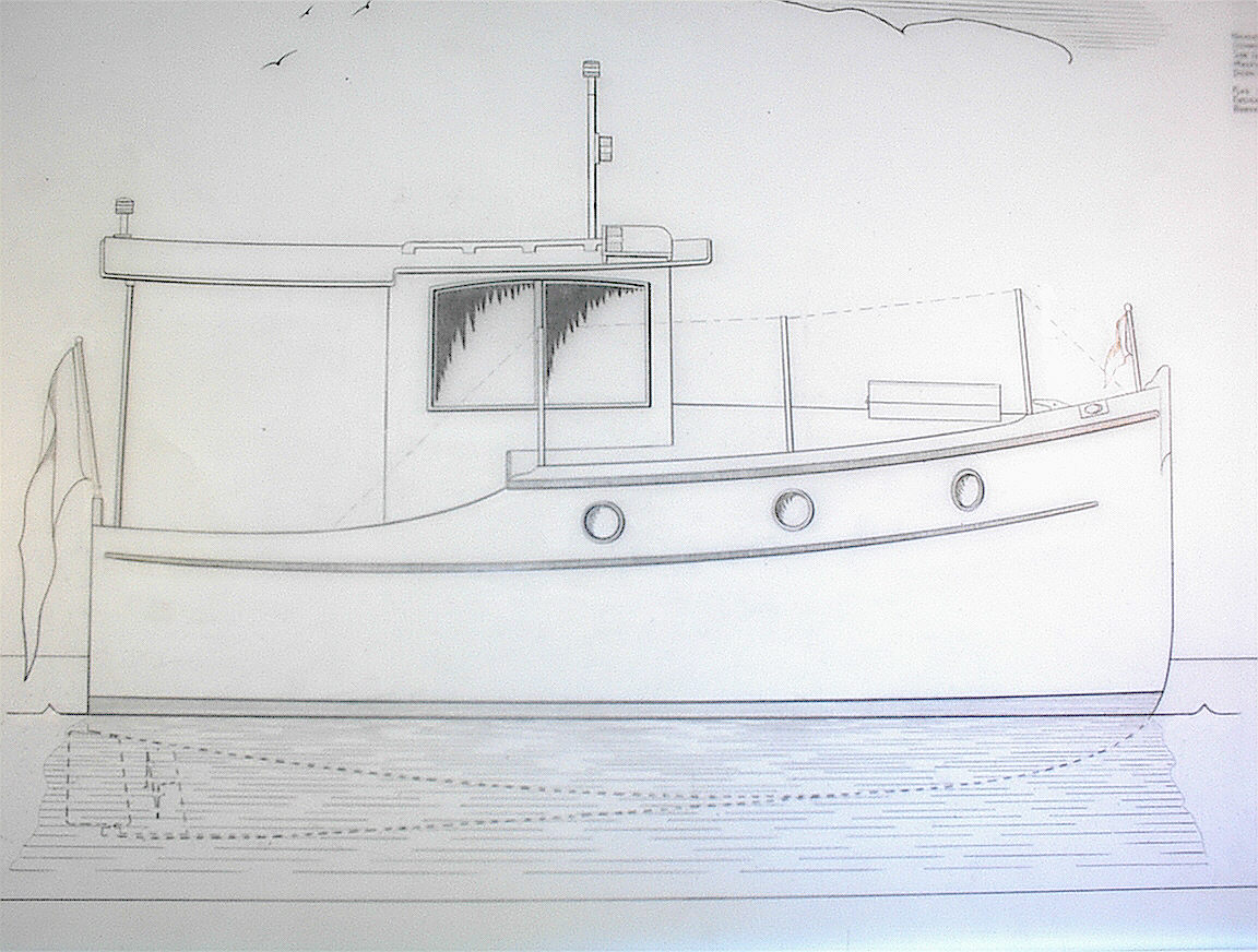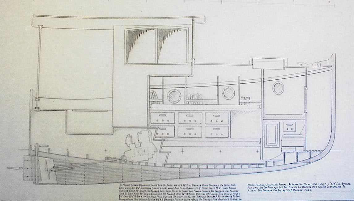 Sometime in the late 1990s I traced the original sketch in ink and put it in the idea designs section of our web site. When she attracted frequent interest and yearning communications from people all over the world, it was obvious we should develop her somehow. When Sven needed a project that would advance his professional qualifications in some areas related to his studies with our Yacht Design School, we had him sit down and translate her into a working set of plans. I fear that the vision I had of her was so complete in my head that I must have driven him nearly crazy getting him to get my vision on the drafting film. Fortunately Sven is very good so it did work well for both of us, for Maddy, and ultimately for the client who builds her.